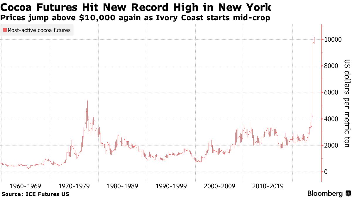 纽约最活跃的合约价格一度上涨至每公吨10193美元的新日内高位。由于西非主要种植国的糟糕收成使全球走向第三个连续年度供应逆差,期货今年已经翻了一番多。