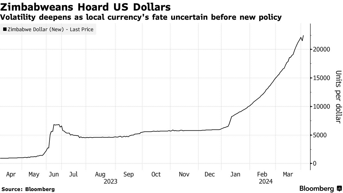 津巴布韦元兑美元汇率达到22,476,今年累计跌幅达73%,仅次于黎巴嫩镑,成为全球表现第二糟糕的货币。在当局提前一个月启用新行长约翰·穆夏亚万胡之后,一种紧迫感笼罩了整个国家。当地媒体报道称,此举是为了宣布一个可能包括采用金本位的新货币计划。