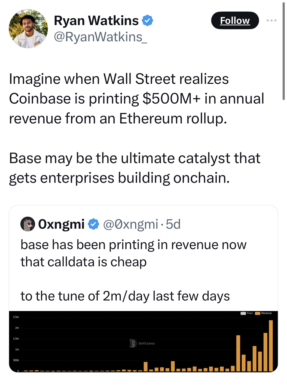 来源: @RyanWatkins](https://twitter.com/RyanWatkins_/status/1773340517587165315)Watkins表示,如果Base成为最常用的链之一,除了memecoin之外的更多应用,“这将是Coinbase的一大胜利。”