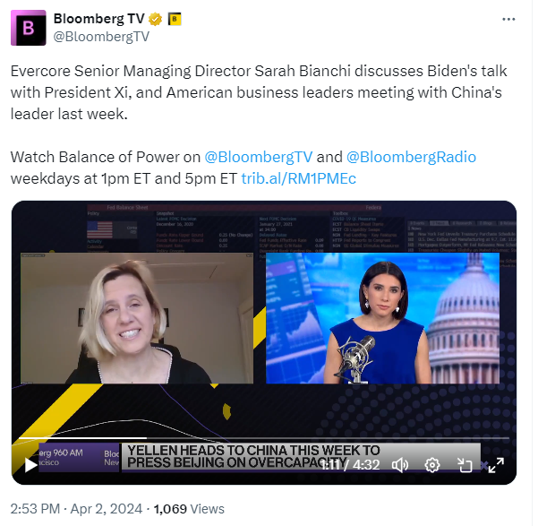今天在彭博电视台的权力平衡早间版节目中,主持人凯莉·莱因兹采访了埃弗科尔公司的高级董事萨拉·比安奇,谈到拜登与中国习近平的会谈,以及上周美国商界领袖与中国领导人的会晤。