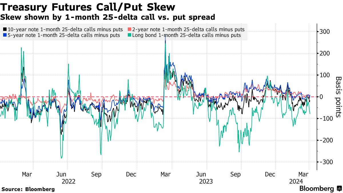 对冲美国国债抛售的保费正在上升。在周二的交易中,用于保护长端收益率上升的成本达到了自2月底以来最昂贵的水平,这反映在所谓的长期债券期货的看涨/看跌偏离上。在美国国债期权市场中,短期波动性策略在上周的五年和十年期限中仍然很受欢迎。周二的交易中,五年期限出现了几笔大额的看涨交易。