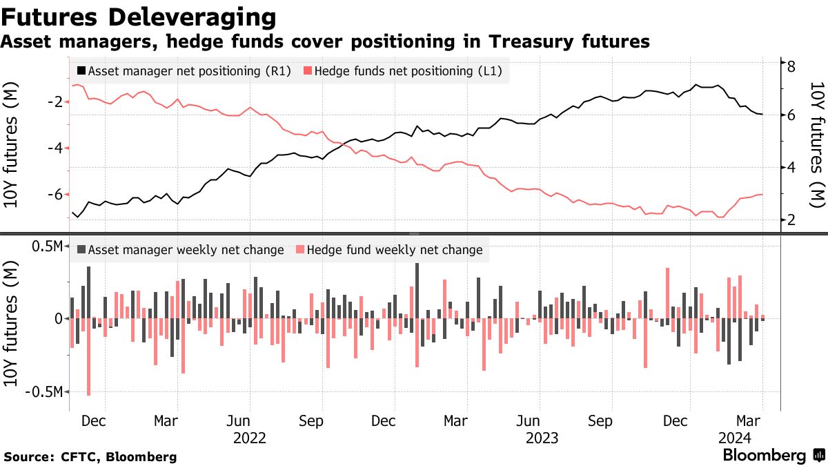 截至3月26日的一周,最新的CFTC数据显示,资产管理人和对冲基金继续进行去杠杆化。美国国债期货的杠杆净空头头寸连续第八周下降至自7月以来的最低水平。除了宏观利率叙事之外,去杠杆化也可能反映了基差交易的持续清算,因为这种策略的背景不太吸引人。资产管理人的净多头头寸也连续第三周减少。