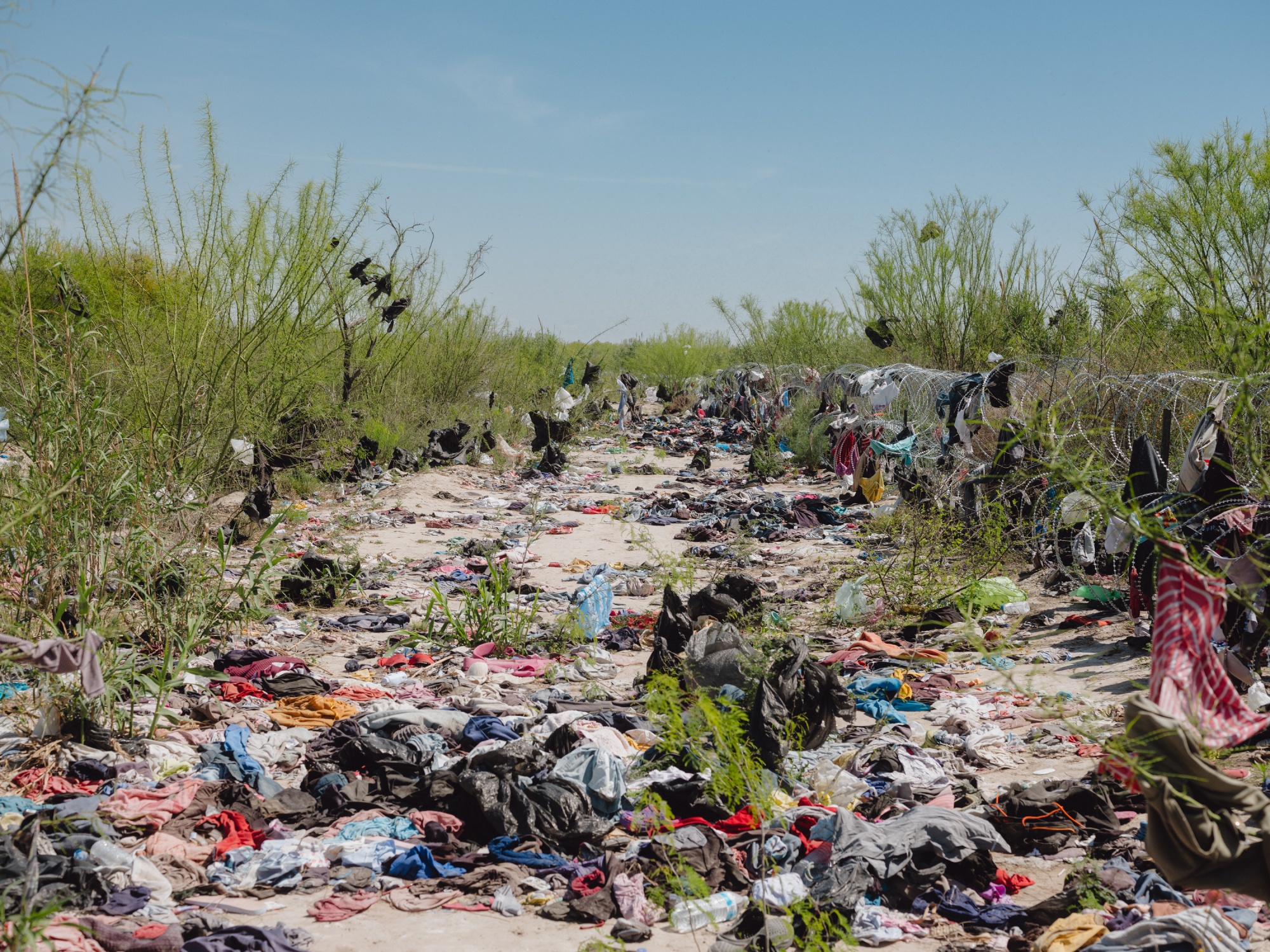 被遗弃在庞乔·内瓦雷斯财产上的移民财物。庞乔·内瓦雷斯在里约格兰德农场边界的铁丝网旨在起到威慑作用。然而,它只造成绝望的移民们身体和衣服受伤和撕裂,他们挤在一起前往德克萨斯州的鹰口岸。