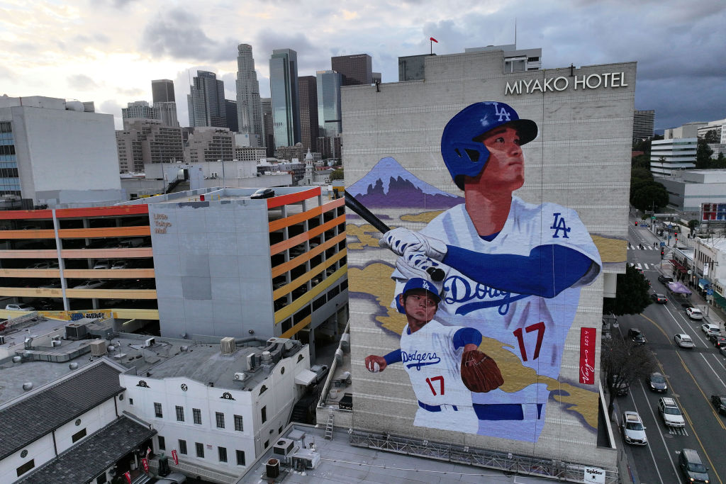 洛杉矶的小东京区域的市区景观,最近完成了一幅描绘洛杉矶道奇队指定击球手大谷翔平的壁画。