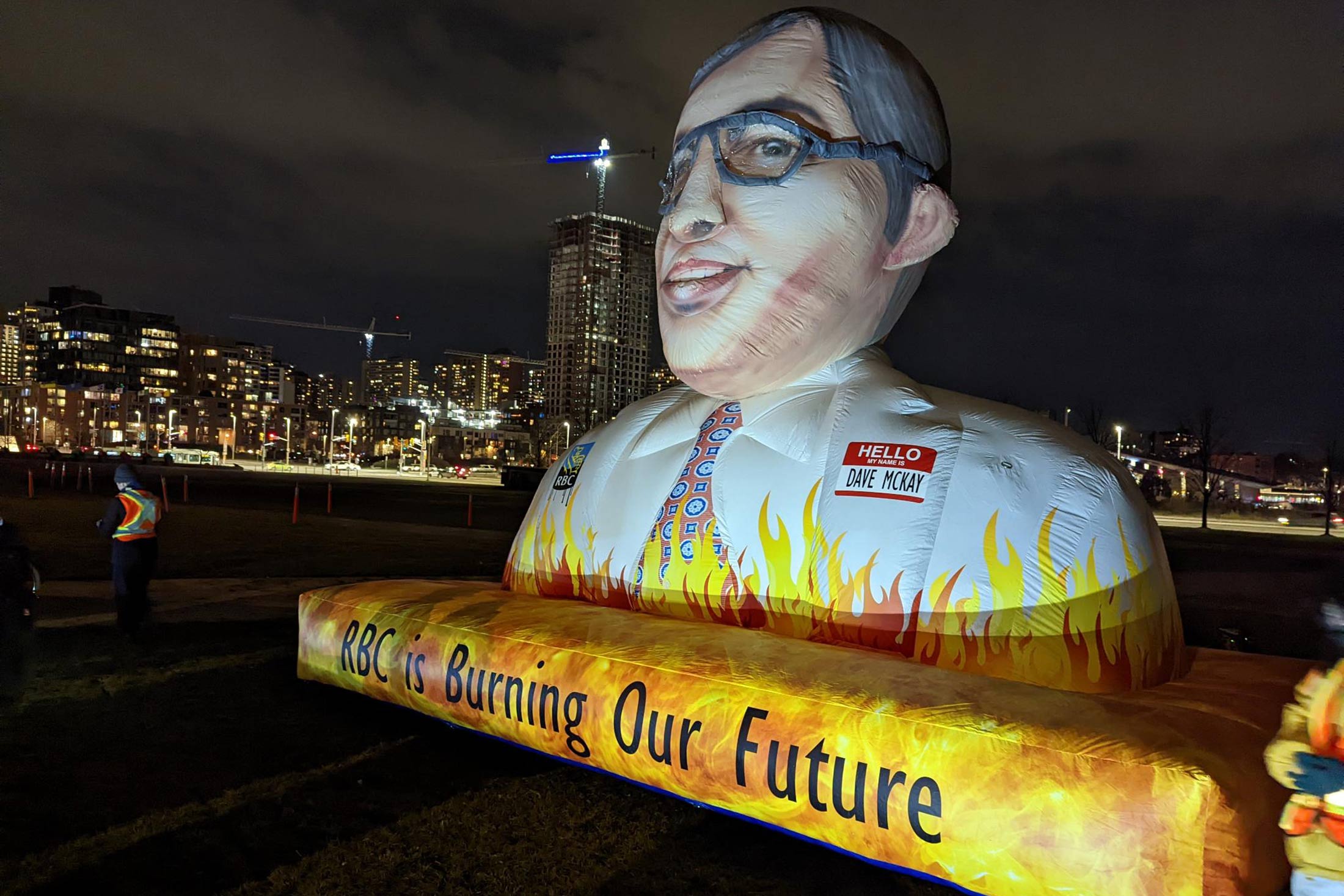 在这座混凝土建筑外,来自绿色和平等团体的大约两打抗议者充气了一个14英尺高的麦凯半身像,底座上刻有“RBC正在焚烧我们的未来”字样。一台高功率投影仪在博物馆的立面上投射出谴责这位首席执行官为气候恶棍(法语中的气候恶棍)的口号。