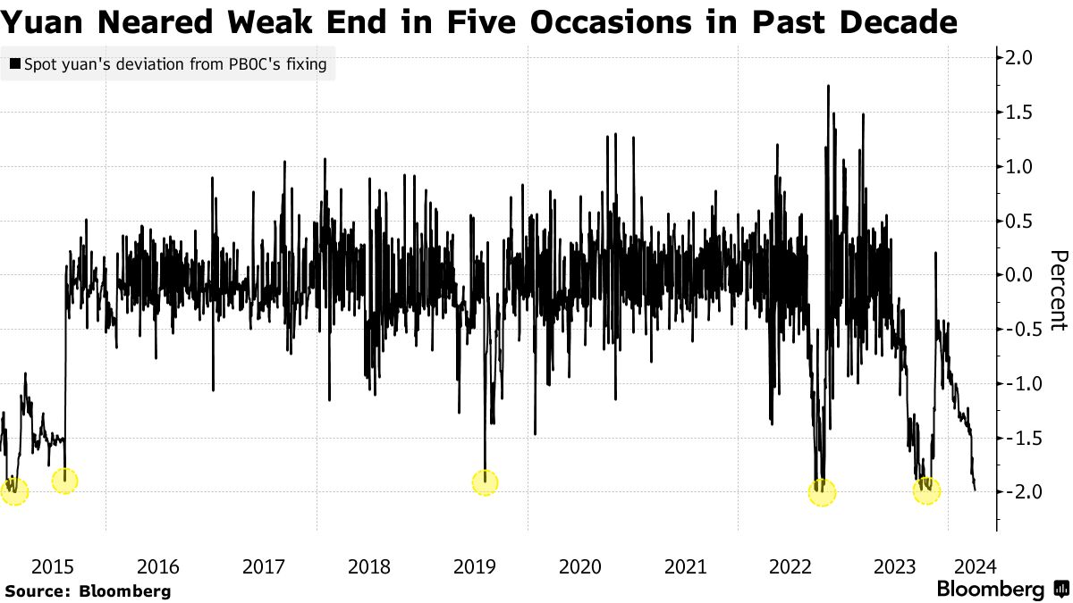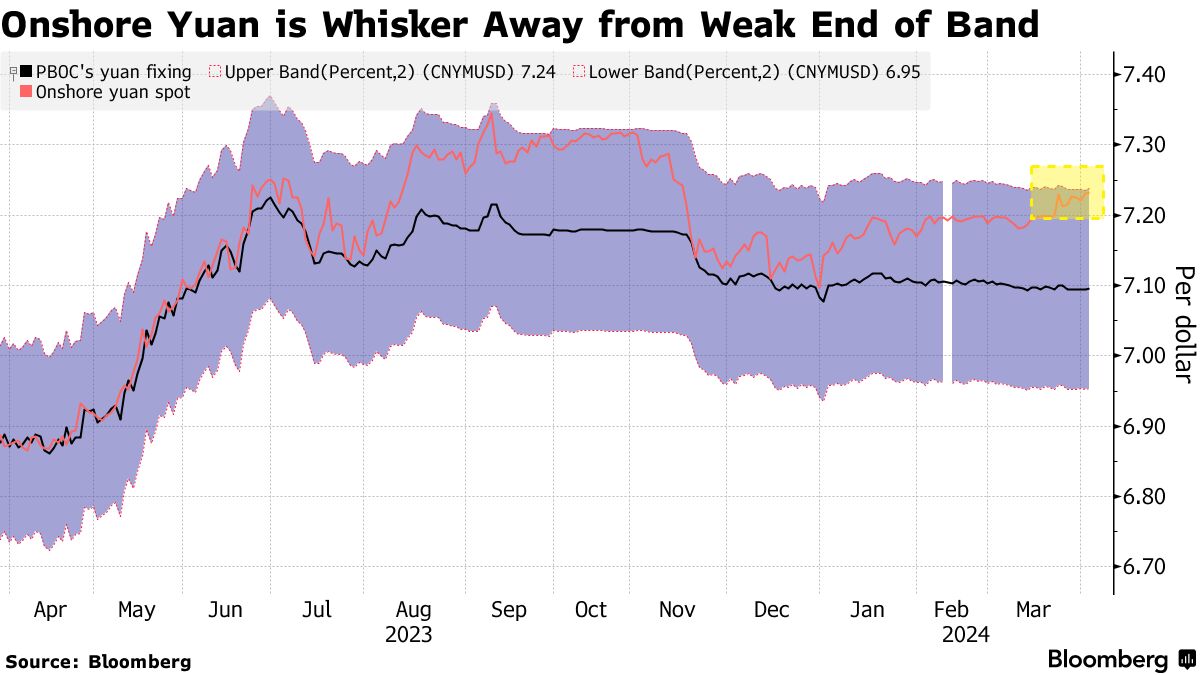 元跌向允许范围的下限,面临央行反击风险 - 彭博社