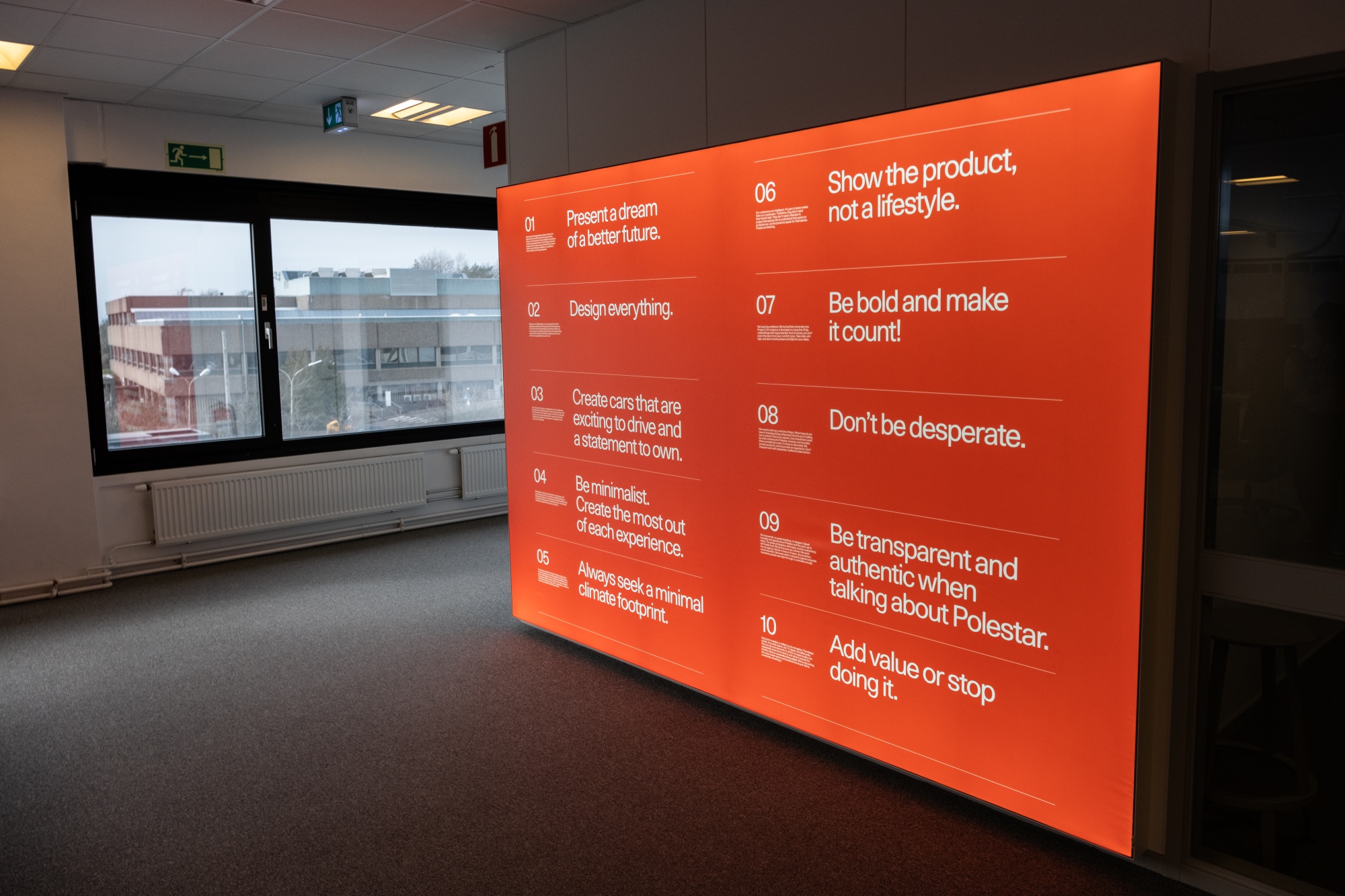 在Polestar Cube展示的包括“始终追求最小气候足迹”在内的企业目标清单。摄影师:Nora Lorek/Bloomberg然而,这些公司每家都相对较小众。去年,Polestar交付了55,000辆车辆,而Rivian则发货了50,000辆卡车,这一产量是福特和通用汽车在不到一周内就可以匹敌的。对于Klarén来说,让主要汽车制造商编制其车辆的生命周期评估报告并公开发布是使汽车碳足迹成为每位购车者决策过程的一部分至关重要。