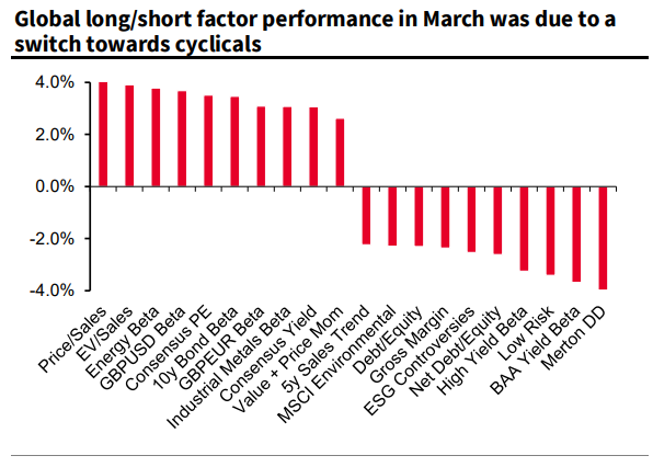 但上个月出现了一个奇怪的现象。拉普索恩对三月份回报驱动因素的分析显示,表现最差的策略是购买财务状况强劲的公司并押注弱势资产负债表。这被标记为Merton DD,因为它使用了诺贝尔奖得主提出的违约接近度指标 罗伯特·C·默顿: