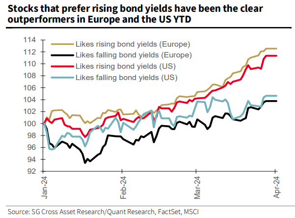 彭博社观点佩尔兹的迪士尼损失结果还不错考虑飞行?价格只会上涨,一路上涨禽流感应该让我们担忧 — 但不要恐慌加利福尼亚将快餐变成了高技能工作理论上,强劲增长期结束的时刻应该是当控制通货膨胀所需的利率(货币成本)上升到负债家庭和公司难以承受的水平时;违约、破产和银行危机可能随之而来。上升的债券收益率确实很重要。正如SocGen的首席量化策略师安德鲁·拉普索恩所展示的,过去在债券收益率上升时蓬勃发展的股票再次如此,而其他股票则被抛在了后面 —— 在美国和欧洲都是如此: