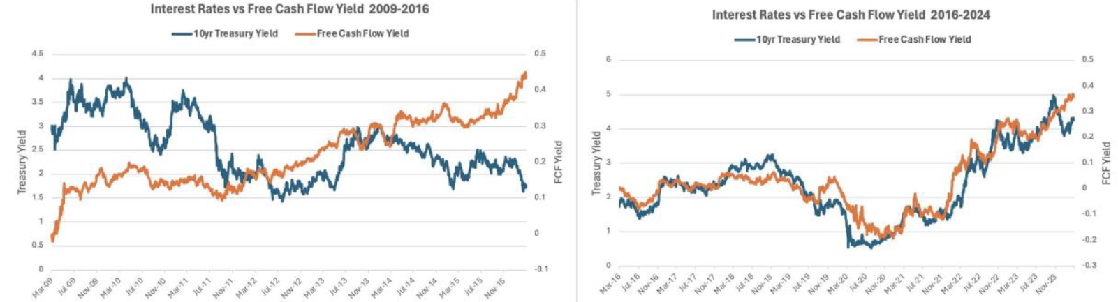 Joseph Mezrich的Metafoura LLC提供了一个关于这一点的视觉表现,他展示了投资于具有高自由现金流收益(经典价值指标)的股票政策的回报如何随着利率的变化而变化。过去并没有强烈的关系;但自2016年以来,两者之间存在着非常紧密的联系: