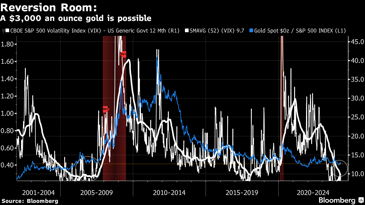 黄金背后的坚定表现是什么?毫无疑问,投资者情绪。黄金对标标普500指数的比率部分解释了他们的推理。彭博智库的迈克·麦克隆认为,股票波动率的VIX指数非常低,而自2007年以来的一年期美国国债利率最高,这应该会在每盎司2000美元左右提供支撑。尽管黄金突破每盎司3000美元的可能性令人难以想象,但这并非完全不可逾越。