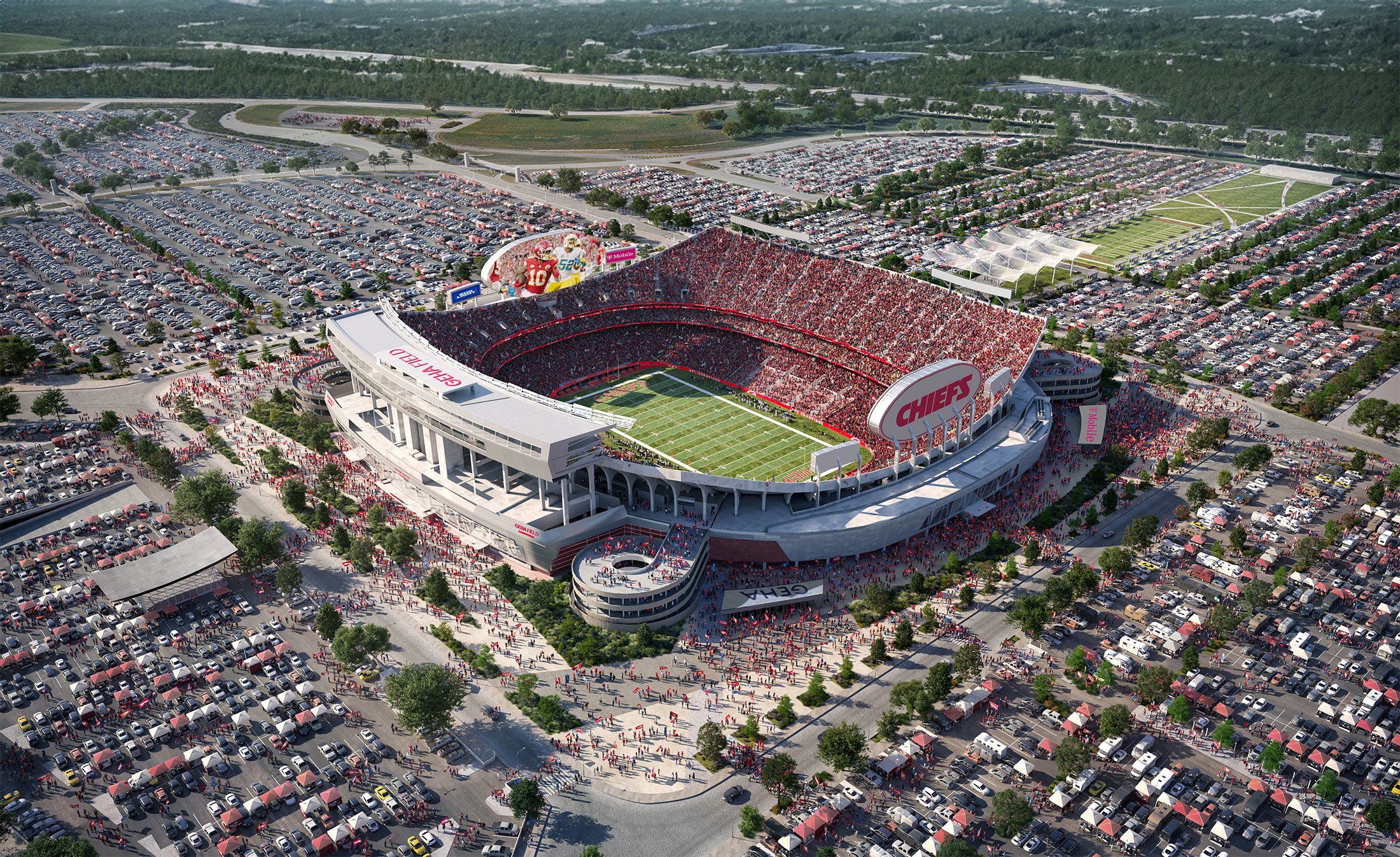 一个阿罗哈德体育场的概念渲染。来源:Populous堪萨斯城地区的选民否决了延长销售税以资助NFL的堪萨斯城酋长队和MLB的皇家队的体育场项目,增加了这两支球队可能离开该市的风险。威胁。