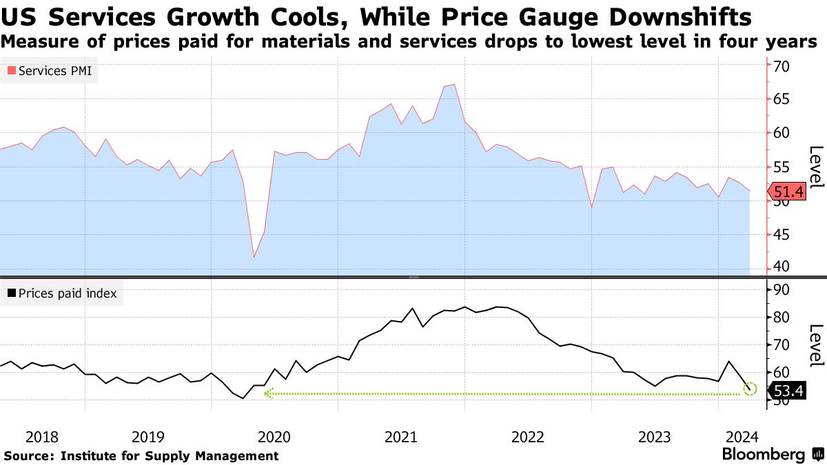 美国服务业增长放缓,价格指数降至四年低点 - 彭博社