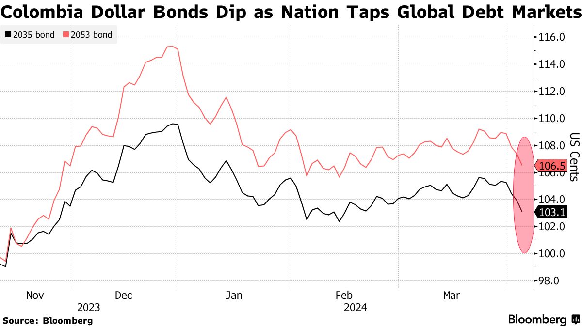 这些债券去年以两期交易方式发行,该国筹集了25亿美元,票面利率分别为8%和8.75%。标普全球评级公司在1月将哥伦比亚的信用展望调降至负面,原因是“潜在持续疲弱的投资者信心可能拖累增长”。