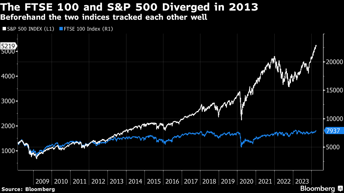 但是当你比较股票市场表现时,差异就显著了。仅仅看一下后全球金融危机时期,你会发现英国的富时100指数现在已经翻了一番多,该指数交易价格略高于2020年3月疫情前的高点。