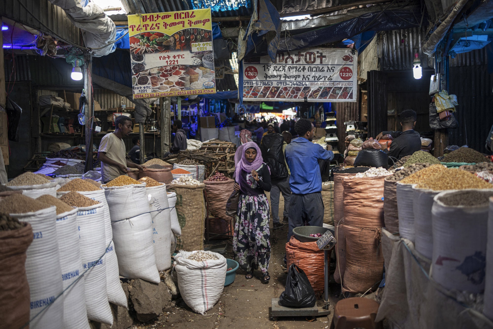 购物者在埃塞俄比亚首都亚的斯亚贝巴的Shola市场行走。