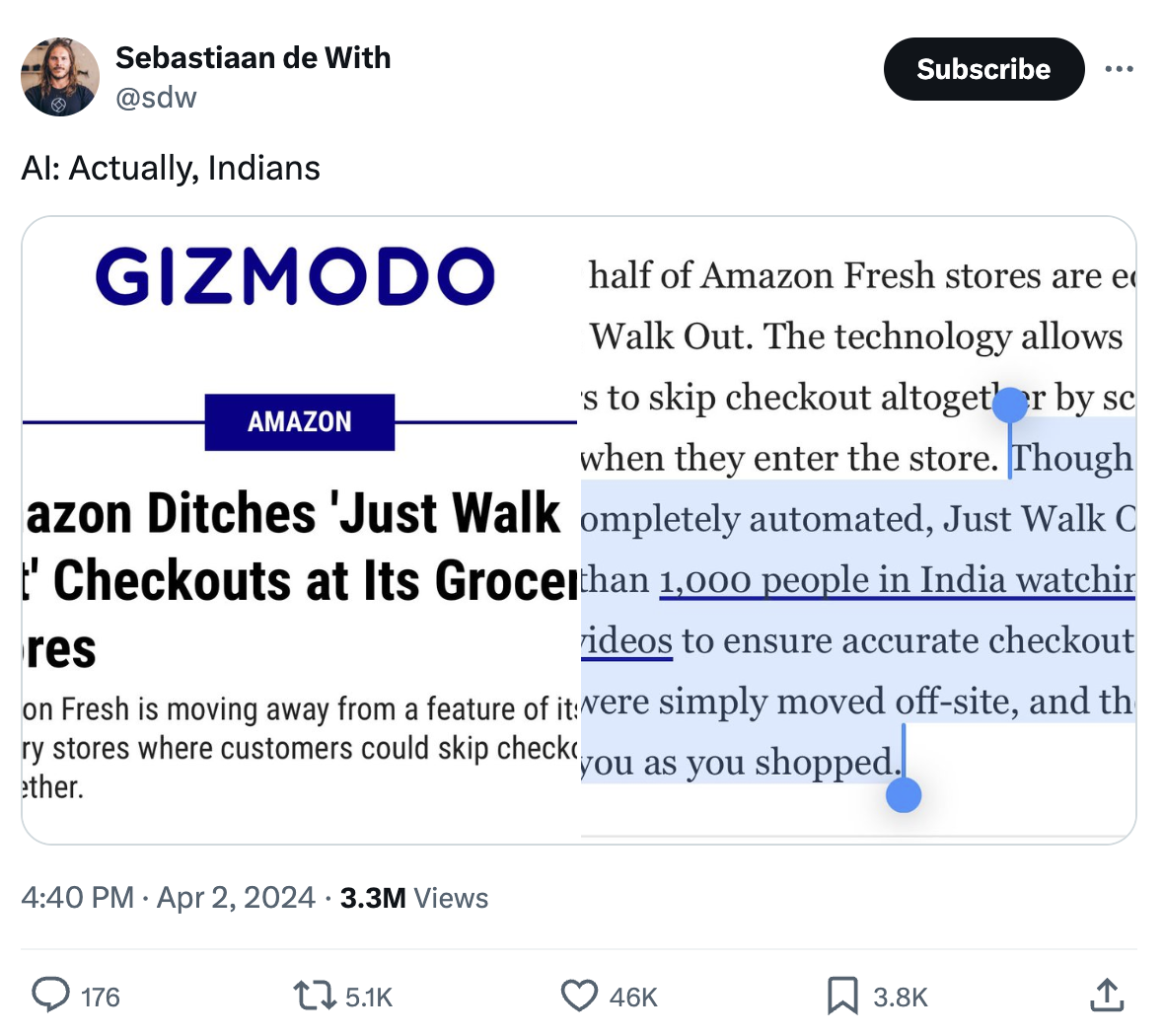 Parmy Olson 表示 这一令人尴尬的企业失败凸显了人工智能领域的灰色地带,数百万秘密工作的人经常被聘请来训练算法,但最终却大部分时间在看护他们的工作。她写道:“在虚假到成功之间存在一条细微的界限——以在幕后使用人员为理由,他们最终将被算法取代——并利用围绕人工智能的炒作和模糊定义来夸大技术的能力。” 亚马逊的AI收银员被1000名穿风衣的管理员绝对感觉像对我来说是剥削!