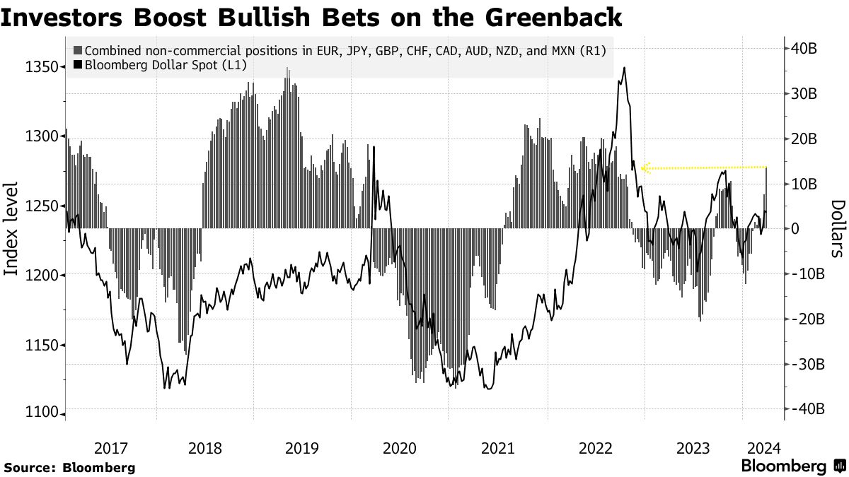 投资者们也在购买这种新现实,最近几周加大了对美元走强的押注。根据美国商品期货交易委员会截至3月26日的数据显示,一个非商业交易者头寸的指标 — 包括资产管理人员、对冲基金和其他投机市场参与者在内的一组人 — 目前是自2022年以来最多头寸。