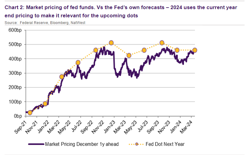 第一次降息将何时发生仍然是一个悬而未决的问题。彭博社的世界利率概率,来源于联邦基金期货,表明市场现在正在定价约60%的可能性会在六月进行利率调整,这比鲍威尔露面前的50%有所提高,但仍然没有明确的结论。对于预期的降息幅度,犹豫也延伸到了更重要的地步,这可能比第一次降息的时间更为重要。年初定价的慷慨的170个基点的降息幅度现在已经下降到70个基点,正如NatWest Markets在这张图表中展示的那样,这是投资者首次预期比联邦储备委员会季度“点阵图”中对年底预测的共识更少的情况,自2022年以来,那是在加息周期期间: