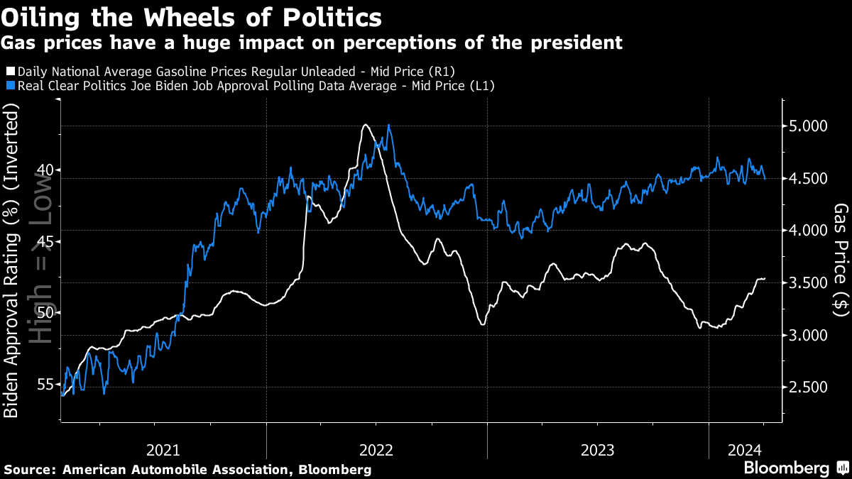 去年油价下跌未能扭转拜登的支持率下降。油价上涨到4美元或更高可能与现任政府的任何错误无关,但可能确保特朗普的第二个任期。如果它们有助于促使金融市场认为通胀正在上升,它们可能会避免希望的降息。渠道卡尼曼,留意加油站上方的发光数字。