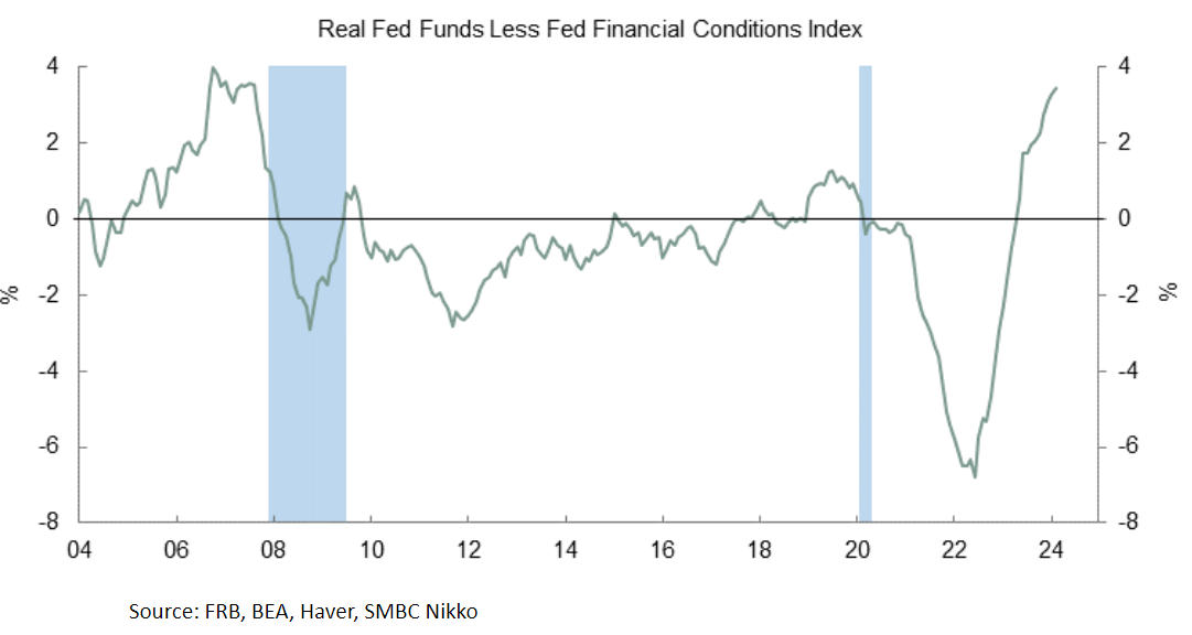 真实的联邦基金利率,定义为联邦基金利率减去PCE通胀率测量,为2.9%,是近17年来最高的。通常情况下,这应该令人担忧。但有一些缓解因素,受到市场乐观情绪的推动,这种乐观情绪已经创造了美联储自己衡量的金融条件的放松,达到了自2022年1月以来未曾见到的水平,当时利率实际上为零,而且对于通胀是否是暂时现象仍然存在激烈的辩论: