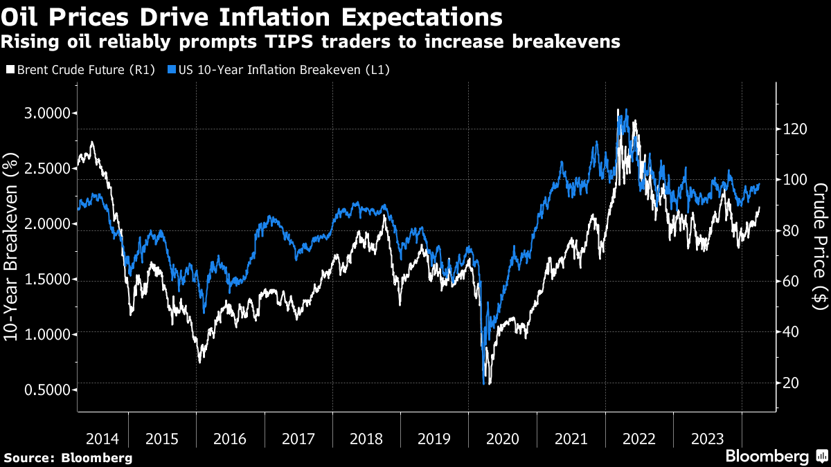 然而,上涨的天然气价格的原因和影响被误解了。随着油价上涨,十年期通胀预期随时间增长 — 即使它们应该相反。随着时间的推移,正如终端的这个双轴图表所示,这种关系非常密切: