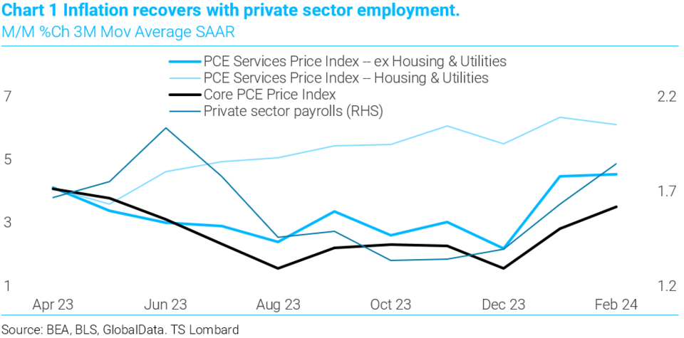 周五的三月就业数据为美联储提供了下一个重要的衡量标准。TS Lombard的Steven Blitz不确定未来会发生什么,但通过使用通胀的三个月滚动平均值显示,趋势再次上升: