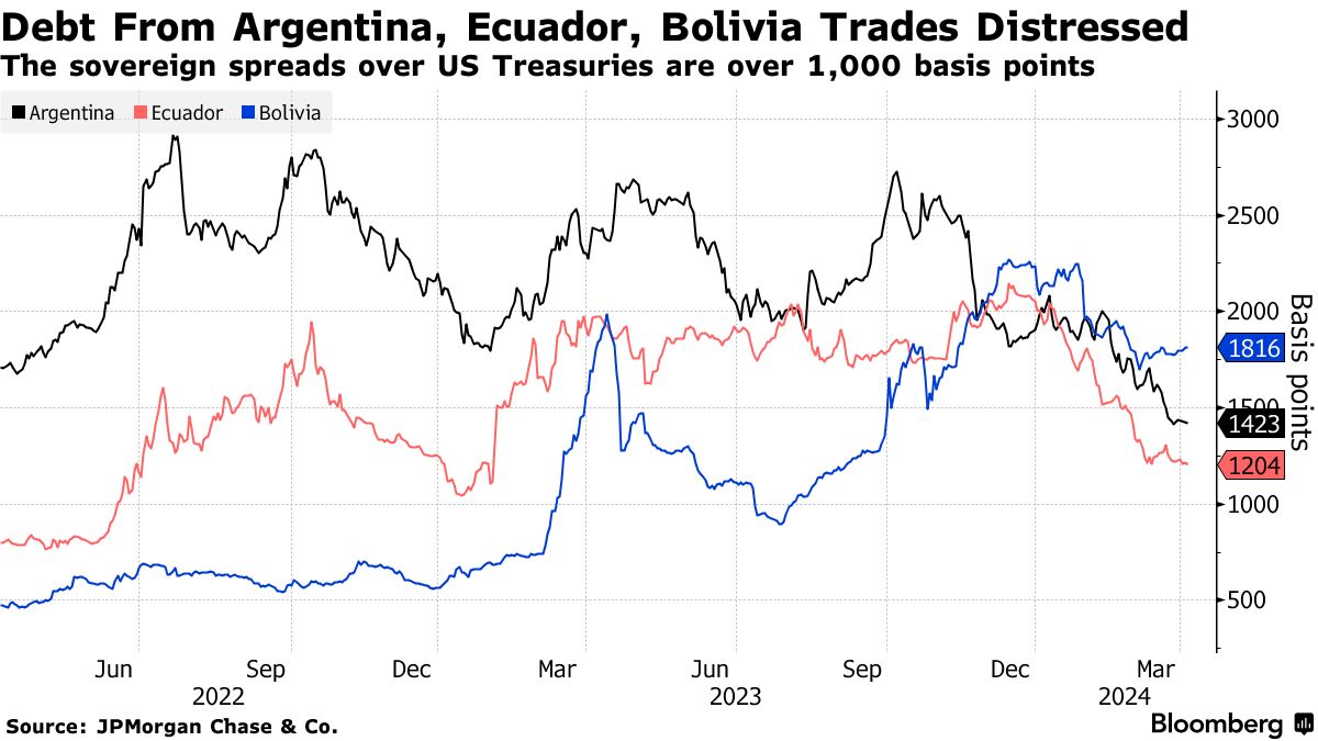 尽管被标记为困境,这些国家的债务收益却异常高。自年初以来,厄瓜多尔的债券回报率为58%,阿根廷为29%,玻利维亚为17%,而彭博指数中新兴市场同行的平均回报率仅约为1.8%。