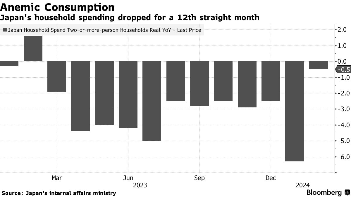 消费者支出疲软一直拖累着该国的经济复苏道路。日本在去年最后三个月勉强避免陷入衰退,强劲的企业投资抵消了疲弱的私人支出。一些经济学家预计,由于消费低迷,该国今年的经济增长将在一定程度上放缓。