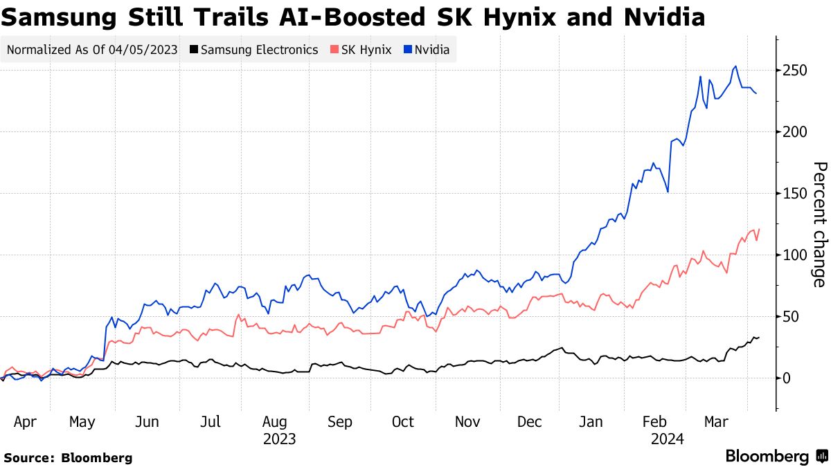 基金经理已经开始将资金转移到首尔上市的三星股票,以迎接预期的反弹。尽管人工智能巨头Nvidia公司在过去12个月里翻了三倍,其关键的HBM供应商SK海力士的股价翻了一倍多,但三星的涨幅仅为32%,因此被认为有更大的上涨空间。