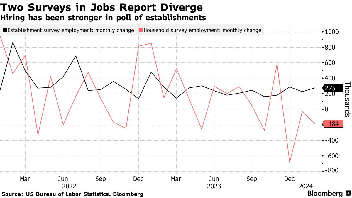 “用于制作就业报告的两项主要调查似乎捕捉到两种非常不同的经济现实,”他们写道。“家庭调查显示,家庭感受到了劳动力市场降温的痛苦,更多工人停滞在失业人群中。”
