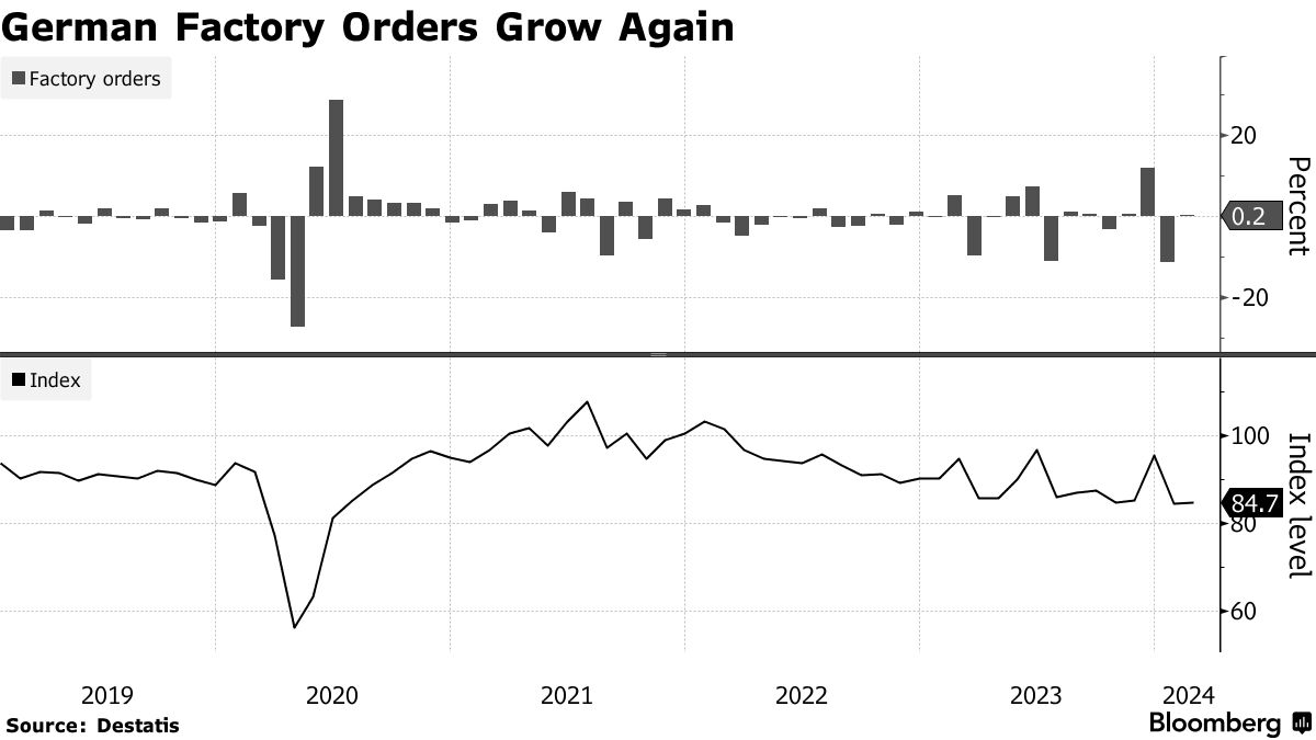 德国工厂订单数据周五发布,显示需求环比增长0.2%。