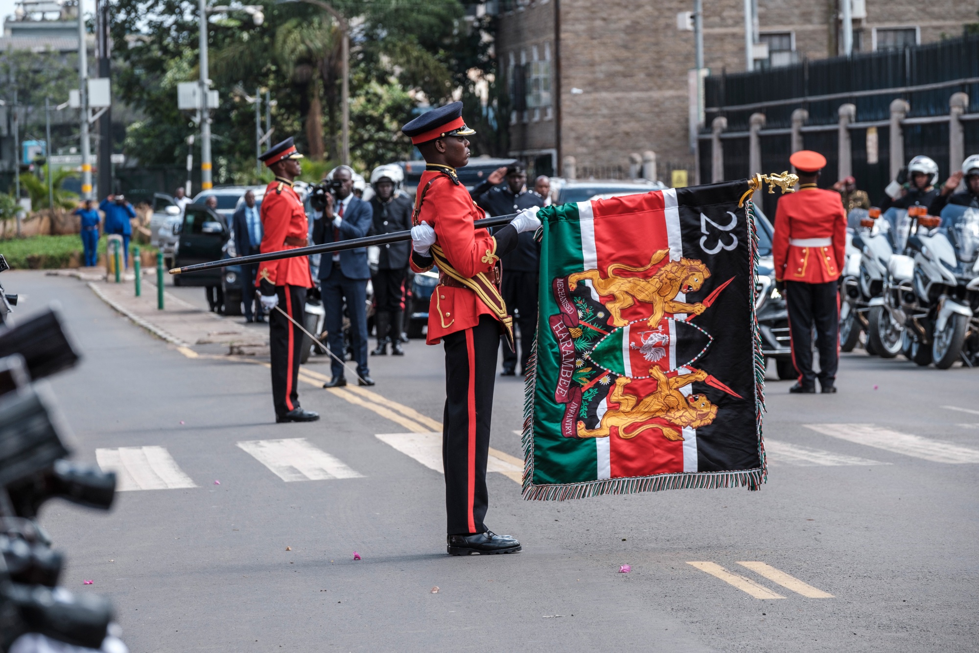 一名仪仗队成员在肯尼亚内罗毕举行的活动中挥舞着肯尼亚国旗,时间是11月9日。