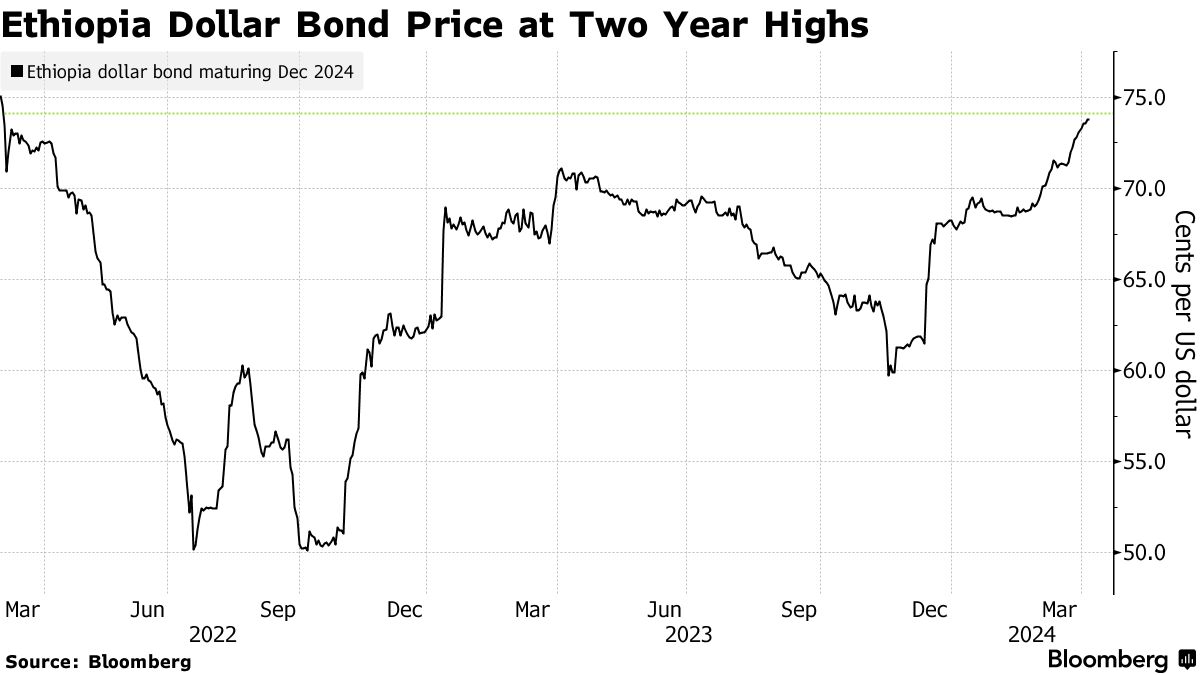 最新的涨幅似乎是受到财政部声明的推动,宣布与世界银行签署了价值17.2亿美元的信贷和赠款协议。周四,债权国巴黎俱乐部据说同意将埃塞俄比亚的IMF救助截止日期延长三个月。如果没有这个延期,债权人可能会宣布之前达成的债务服务暂停协议无效。