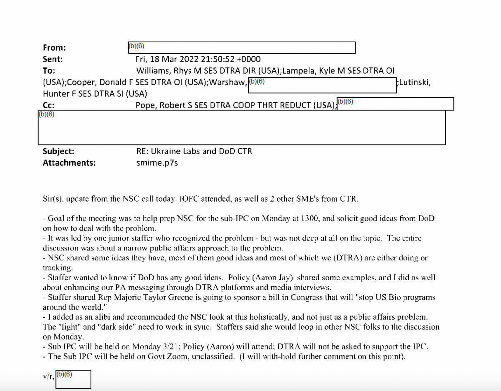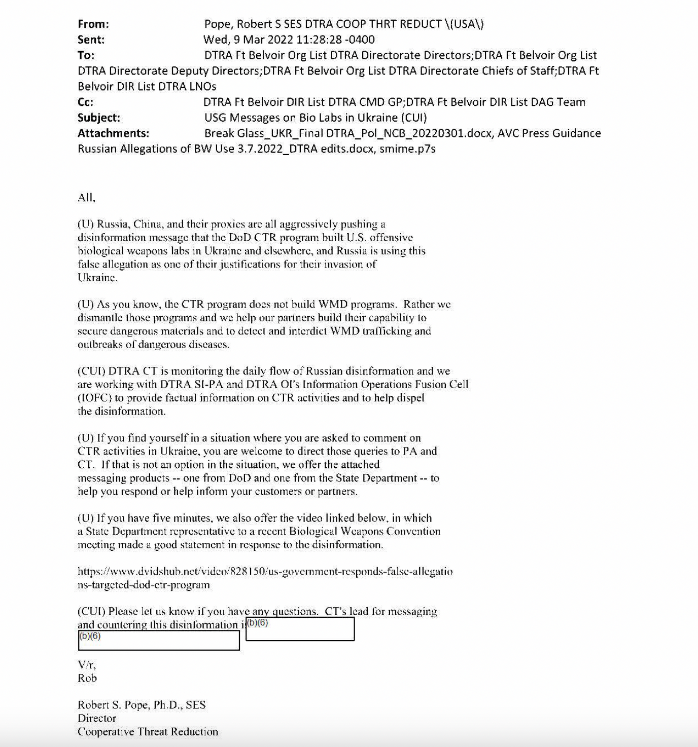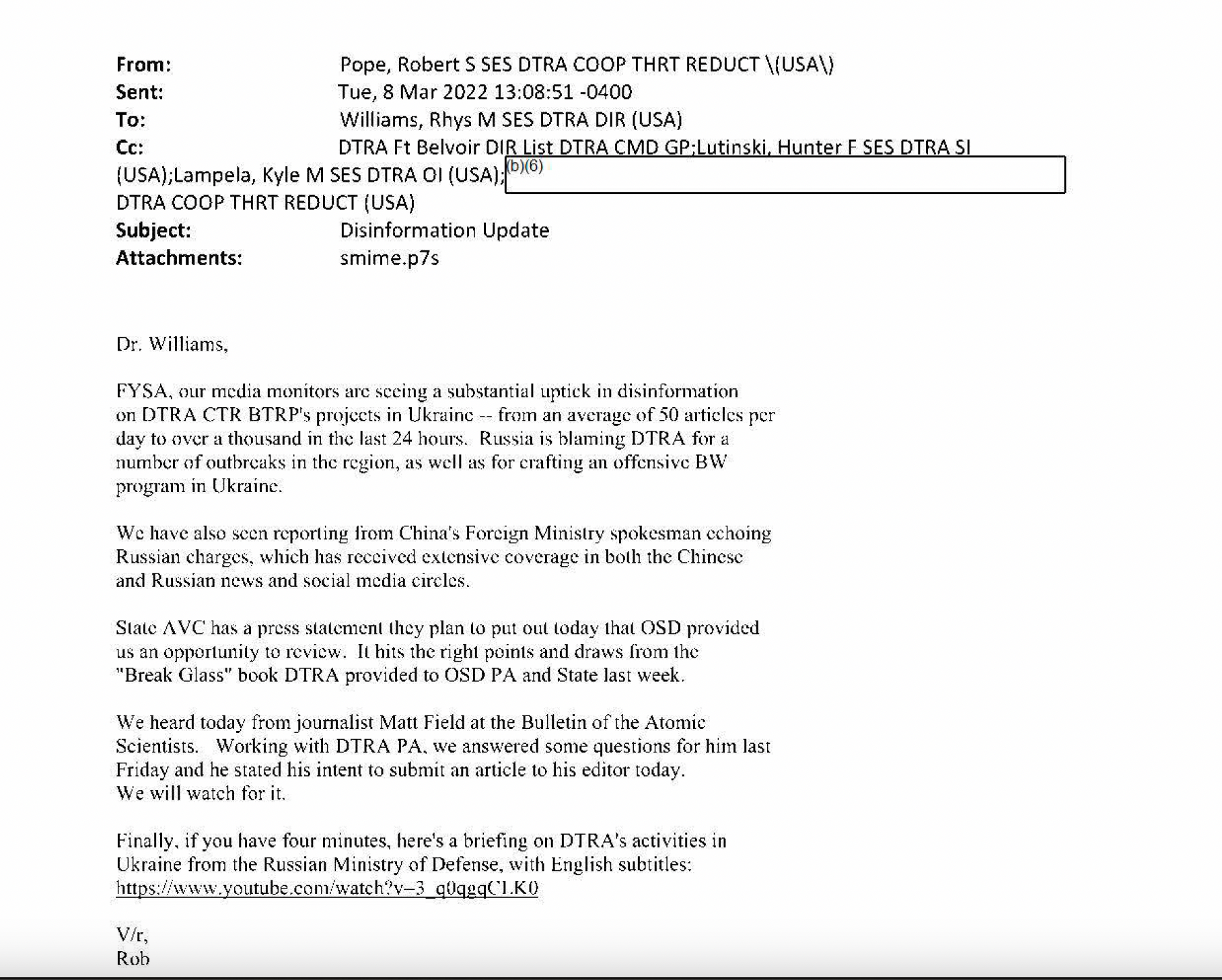 “昨天俄罗斯的宣传文件中提到了几位DTRA人员的姓名、照片和简介,” 教皇写信给威廉斯说。“将DTRA的安全和反情报领导加入抄送名单以便了解情况。”