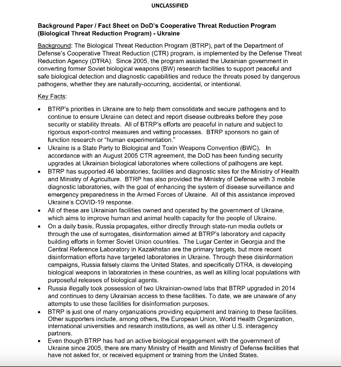 2005年,乌克兰内部的工作通过另一个旨在控制传染病传播的DTRA计划扩大:生物威胁削减计划。当时的乌克兰总统列昂尼德·库奇马请求美国帮助减少前苏联生物武器实验室内危险病原体的威胁。从那时起,美国在乌克兰的实验室上花费了约2亿美元用于培训、设备和升级。