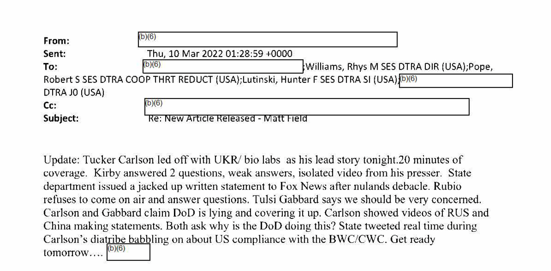 *点击这里查看文件(第1页)*我花了一年多的时间才解放了DTRA的记录。一些记录根据隐私豁免和所谓的审慎过程特权进行了编辑,FOIA中被滥用的最多的豁免。尽管如此,这里面有很多内容。这些文件提供了一个罕见的幕后视角,揭示了乌克兰入侵后的关键两个月内不断升级的虚假信息战。