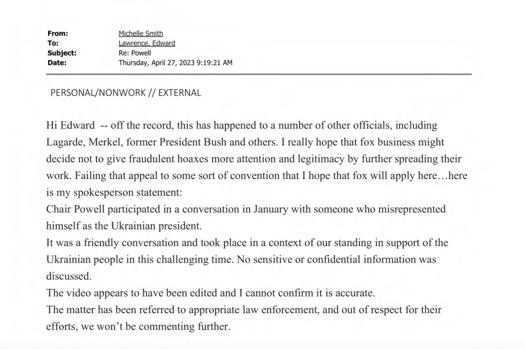 在一封电子邮件中,当一名福克斯新闻记者问及此事时,一位发言人对此事件不以为然,称这样的恶作剧电话“已经发生在许多其他官员身上”,包括欧洲央行行长克里斯汀·拉加德、前德国总理安格拉·默克尔和前总统乔治·W·布什(以及他的父亲)。