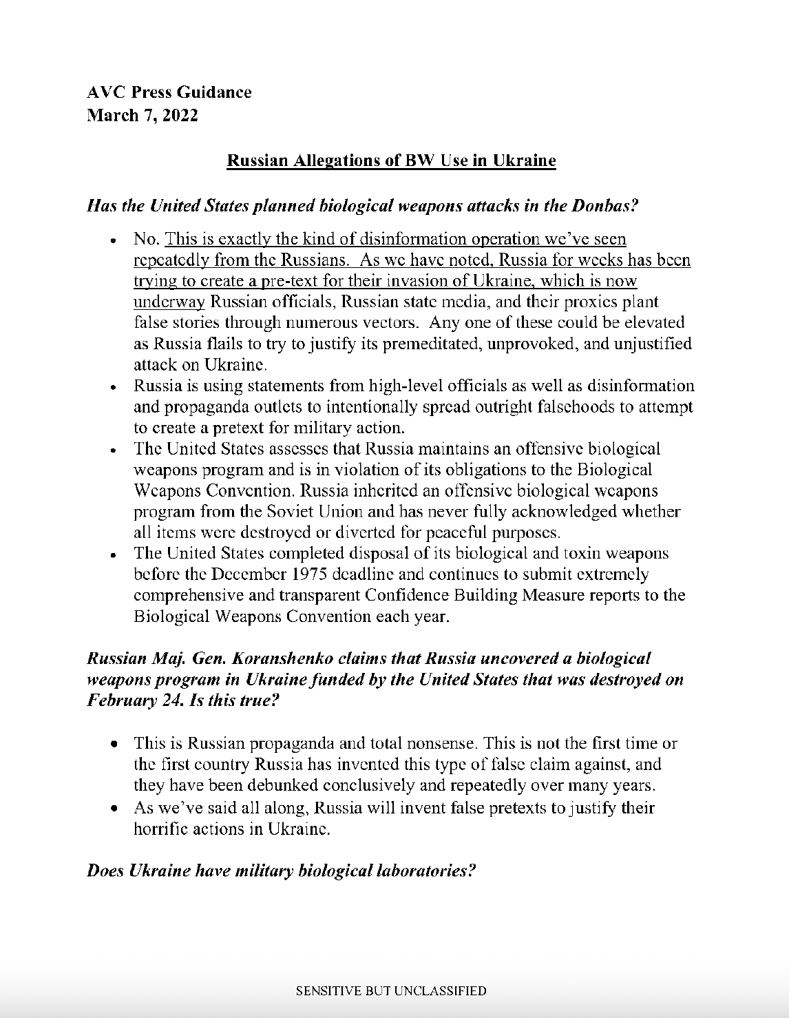 *点击这里查看文件(第1124页)*随着俄罗斯的信息战演变为一场轻微的外交危机,拜登政府变得越来越绝望。3月18日,一名白宫官员警告说,俄罗斯正准备在联合国安理会(UNSC)会议上传播虚假的乌克兰实验室指控。