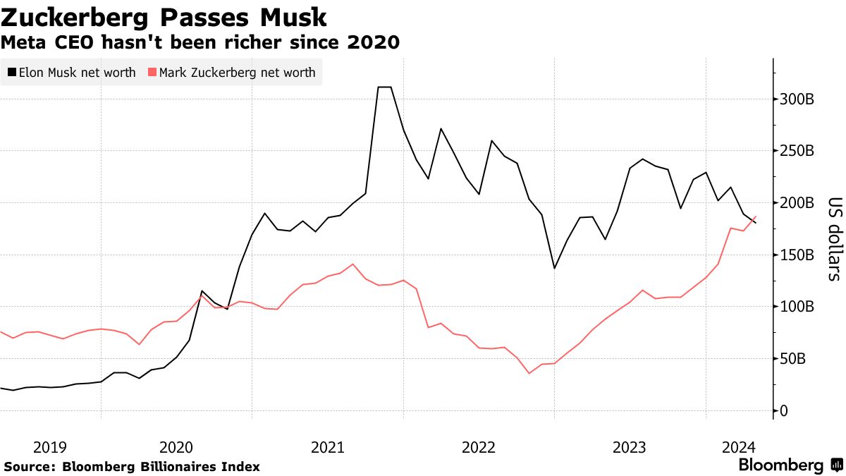 今年以来,马斯克的财富缩水了484亿美元,而扎克伯格的财富增加了589亿美元,因为 Meta Platforms Inc. 的股价不断攀升,包括周五创下的新纪录。
