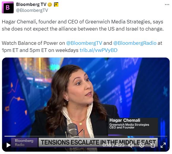 今天在彭博电视台的 权力平衡 早间版节目中,主持人乔·马修和凯莉·莱因兹采访了格林威治媒体战略公司创始人、中东专家哈加尔·谢马利,谈论了加沙战争对美以关系的影响。