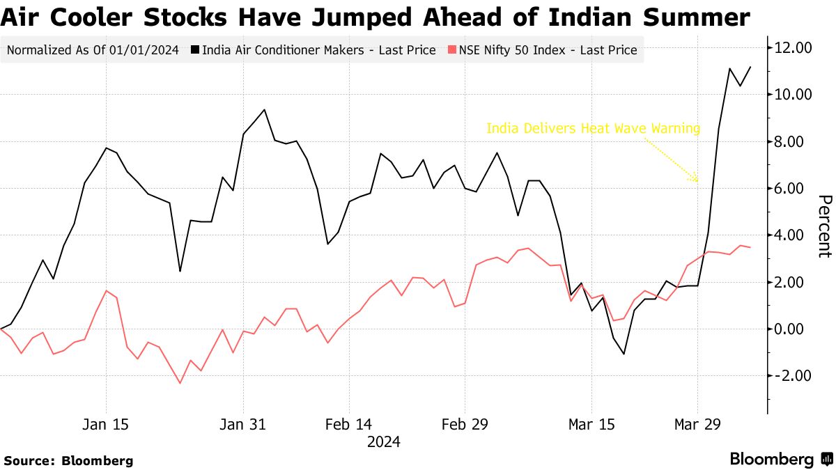 制造空调、冷却器和风扇的公司股价迅速对天气预警做出反应。一个由八家制造空调产品公司组成的等权重队列本周上涨了超过8%。