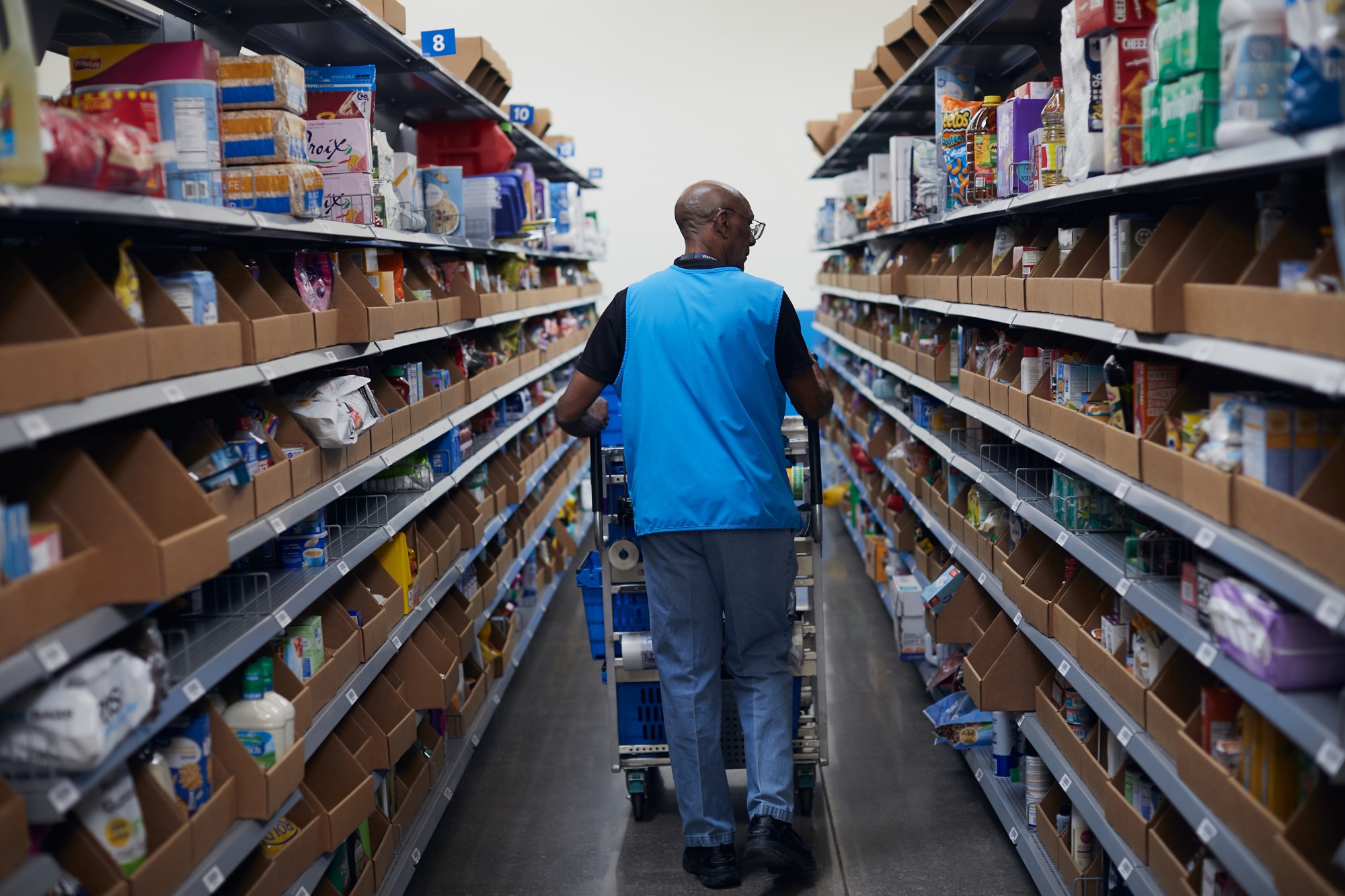 一名员工在得克萨斯州葡萄酒市的一个订单配送中心收集在线订单。