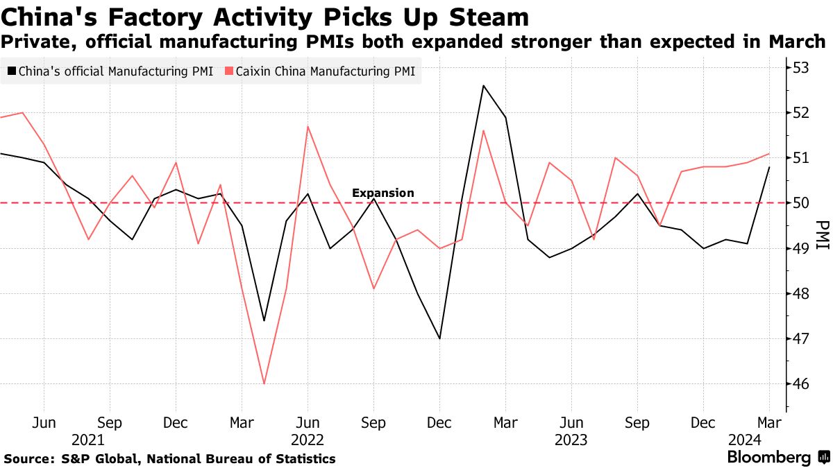 中国的工厂活动在三月份超出预期,提振了人们对该国能够实现今年约5%增长目标的乐观情绪。财新制造业采购经理人指数上升至51.1 — 超过50的标志,表明连续第五个月扩张,这是两年多以来最长的连续增长。