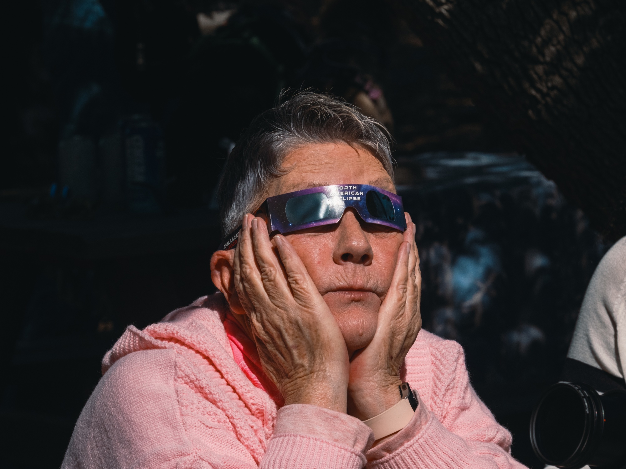 一个观众在德克萨斯州去年的日食期间戴着太阳观测眼镜。虽然美国将于周一再次迎来日食,但美国蓬勃发展的就业市场并没有受到任何阴影的影响。