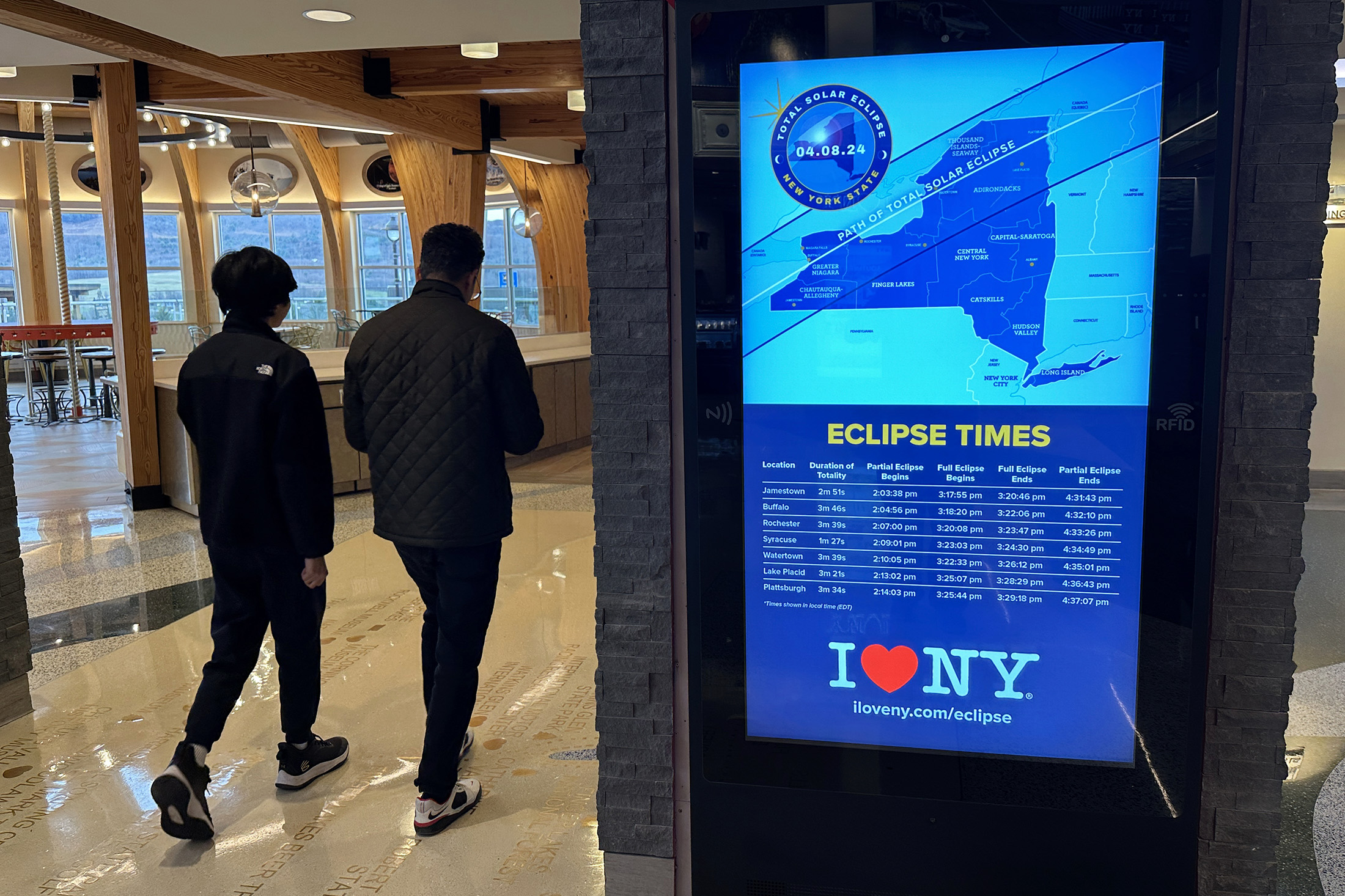 一个标志告知人们纽约州柯克伍德的81号州际公路休息站即将发生的日全食时间。摄影师:泰德·沙弗里/AP纽约州北部和西部的许多城镇将在周一迎来难得的时刻 —— 当它们被完全黑暗所笼罩时。