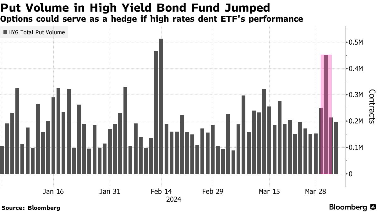 与iShares iBoxx高收益公司债券ETF(代号HYG)相关的看跌期权交易量激增,这表明投资者正在为央行再次令人失望做准备。与该基金相关的对冲将有可能在央行的紧缩政策推动利率敏感基金下跌时获利。