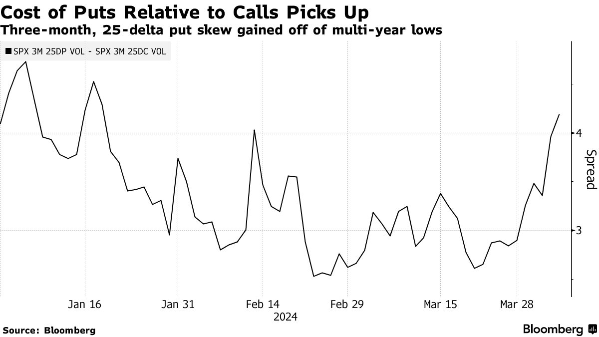 自3月下旬以来,投资者逐渐增加对冲头寸,将看跌期权的成本推高至自1月中旬以来看涨合约的最大溢价。这些头寸增加了今年备受关注的保险 —— 针对重大崩盘而非轻微调整的尾部风险对冲。