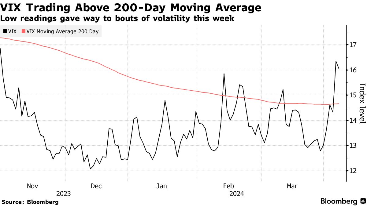 芝加哥期权交易所波动率指数(VIX)周四收于自去年11月以来的最高水平,周五随着美国股市上涨而下跌。该指数是根据标普500指数30天内隐含波动率的虚值期权价格计算得出的,仍然高于其200日移动平均线。