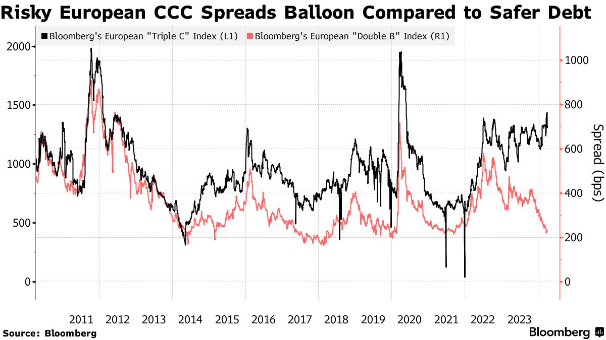 因此,即使更广泛的债券利差收窄到基准水平,投资者也在惩罚CCC评级的债务。在过去两周,欧洲最高风险债券的额外收益率达到了自新冠疫情关闭整个行业并且欧元区债务危机爆发以来的最高水平。在美国,扩大幅度不那么夸张,但仍在发生。